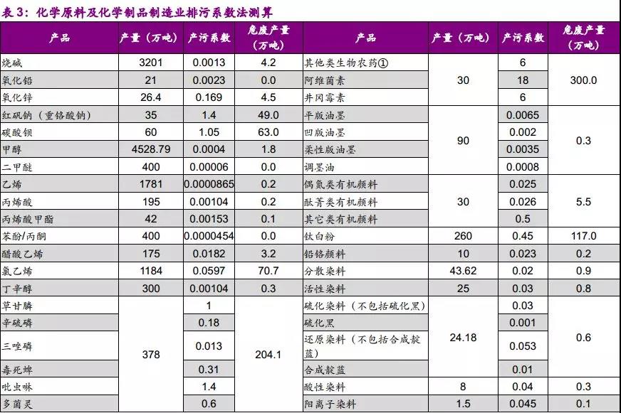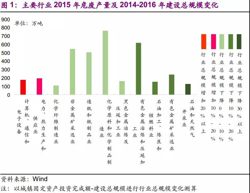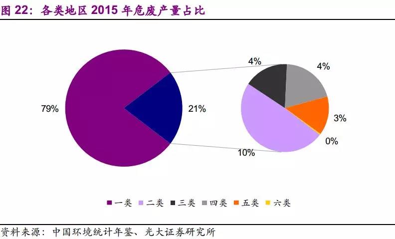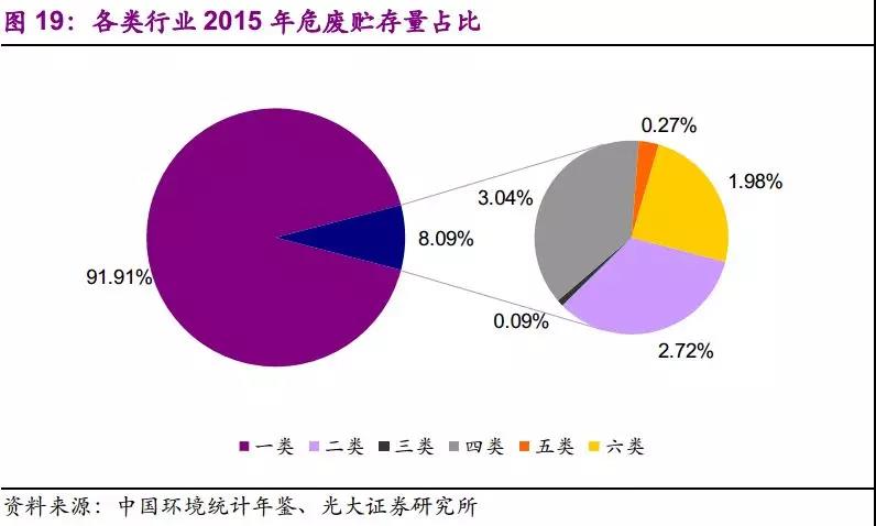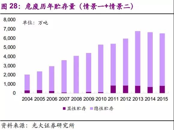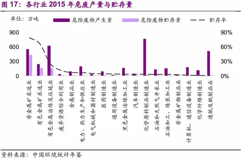 ◆增量部分:自上而下,從工業(yè)增加值的角度:產(chǎn)廢強(qiáng)度不變的情況下,危廢每年新增1.1億噸;若考慮到工藝進(jìn)步引起的危廢產(chǎn)生強(qiáng)度下降,在樂(lè)觀、中觀、悲觀三種預(yù)期下,2017年實(shí)際工業(yè)危廢產(chǎn)量分別為6706、7546和8666萬(wàn)噸。自下而上,從產(chǎn)污系數(shù)的角度:我們根據(jù)現(xiàn)有最新數(shù)據(jù)及不完全統(tǒng)計(jì), 2016年,化學(xué)原料和化學(xué)制品制造業(yè)和有色金屬冶煉和壓延加工業(yè)分別為1141.6和1082.2萬(wàn)噸。2015年,兩個(gè)行業(yè)危廢產(chǎn)量占總產(chǎn)量比例為34.8%,假設(shè)其比例變化不大,則全國(guó)危廢總產(chǎn)量為6390萬(wàn)噸。