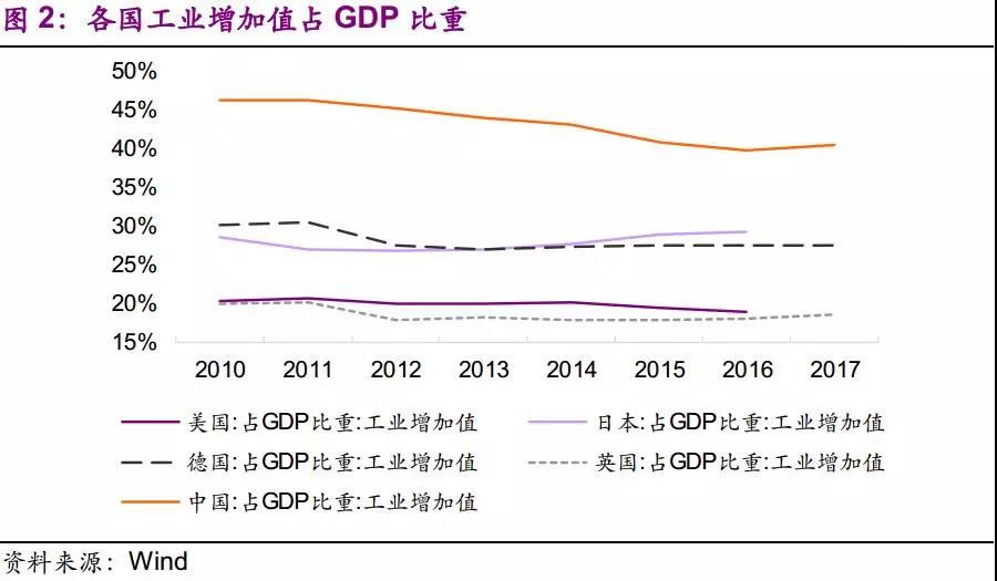工業(yè)增加值占GDP比重仍有下降空間。2010年以來(lái),我國(guó)工業(yè)增加值占GDP比重逐年下降,但整體仍在40%左右水平。從國(guó)際視角來(lái)看,發(fā)達(dá)國(guó)家在20%-30%的水平,這與國(guó)際產(chǎn)業(yè)分工、不同經(jīng)濟(jì)發(fā)展階段側(cè)重點(diǎn)有關(guān)。當(dāng)前,我國(guó)正處在產(chǎn)業(yè)升級(jí)及轉(zhuǎn)型的重要時(shí)期,第三產(chǎn)業(yè)也逐步成為拉動(dòng)經(jīng)濟(jì)增長(zhǎng)的重要引擎之一,預(yù)計(jì)我國(guó)工業(yè)結(jié)構(gòu)將進(jìn)一步優(yōu)化,工業(yè)增加值占GDP比例也有望進(jìn)一步下降。