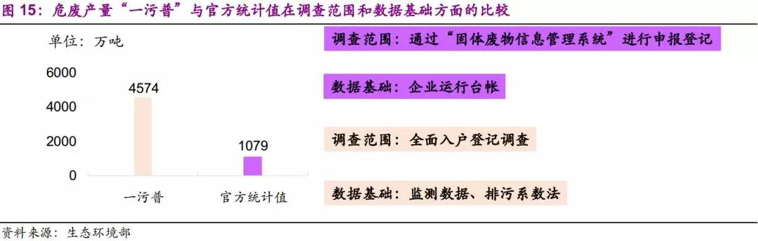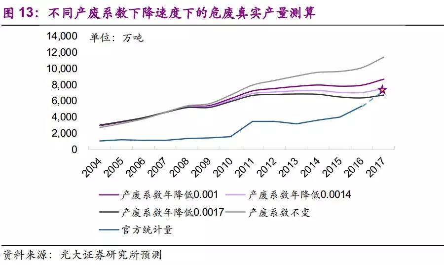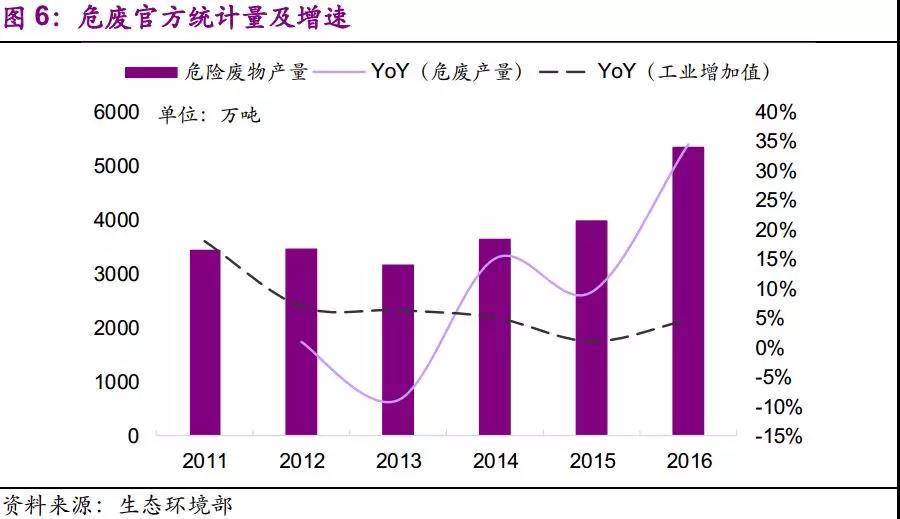 (2)環(huán)保壓力提升,官方統(tǒng)計(jì)量已逐漸彌補(bǔ)先前統(tǒng)計(jì)不足的問(wèn)題。2013年兩高司法解釋后,官方統(tǒng)計(jì)量增速不斷提高,2016年增速34%,遠(yuǎn)高于同期工業(yè)增加值增速5%??紤]到對(duì)危廢申報(bào)登記制度執(zhí)行情況的核查已納入危險(xiǎn)廢物規(guī)范化管理指標(biāo)體系,我們認(rèn)為應(yīng)重視官方統(tǒng)計(jì)量的意義:反映環(huán)保力量所觸及之處的顯性需求。隨著環(huán)保執(zhí)法逐漸深化,隱性需求不斷轉(zhuǎn)化為顯性需求,官方統(tǒng)計(jì)量將更好地體現(xiàn)危廢的產(chǎn)生量,并接近真實(shí)產(chǎn)生量。
