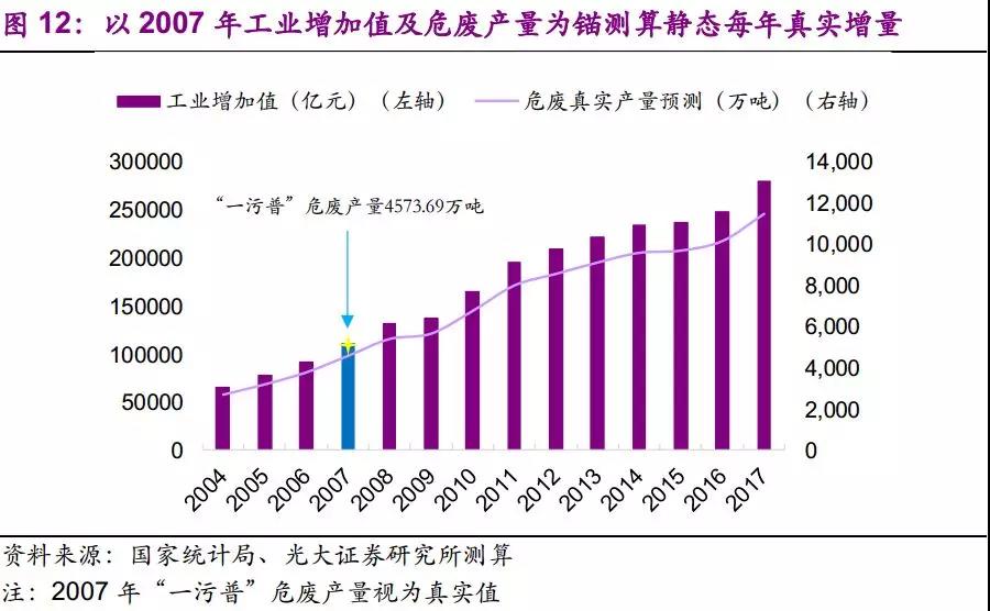 2. 針對(duì)增量市場(chǎng),創(chuàng)新性地提出雙角度危廢產(chǎn)量預(yù)測(cè)模型:1)自上而下——“工業(yè)增加值”角度;2)自下而上——“產(chǎn)污系數(shù)”角度,且兩者預(yù)測(cè)結(jié)果得到了互相驗(yàn)證??紤]到技術(shù)進(jìn)步,將產(chǎn)廢強(qiáng)度(單位工業(yè)增加值危廢產(chǎn)量)下降分為樂(lè)觀、中觀和悲觀三種情景進(jìn)行討論。通過(guò)對(duì)“污染源普查”和“危廢申報(bào)登記”的制度溯源,首次賦予官方統(tǒng)計(jì)量新的意義,而不是對(duì)其進(jìn)行一味地否定。我們認(rèn)為,環(huán)保執(zhí)法趨嚴(yán)背景下,2018年大概率延續(xù)高增速,官方統(tǒng)計(jì)量有望逼近甚至進(jìn)入預(yù)測(cè)區(qū)間。