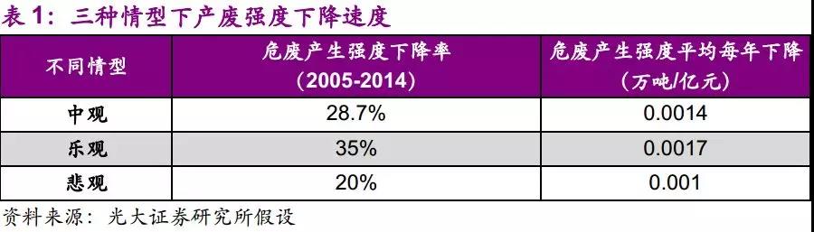 事實(shí)上,隨著技術(shù)和工藝進(jìn)步和工業(yè)結(jié)構(gòu)變化,單位工業(yè)增加值固體廢物產(chǎn)生強(qiáng)度呈逐年下降趨勢(shì)。我們分為樂(lè)觀、中觀、悲觀三種假設(shè)預(yù)期,對(duì)危廢產(chǎn)生強(qiáng)度下降速度對(duì)危廢產(chǎn)量的影響進(jìn)行預(yù)測(cè):假設(shè)中觀情況下,危廢產(chǎn)生強(qiáng)度跟隨固廢產(chǎn)生強(qiáng)度,即2014年比2005年下降28.7%。