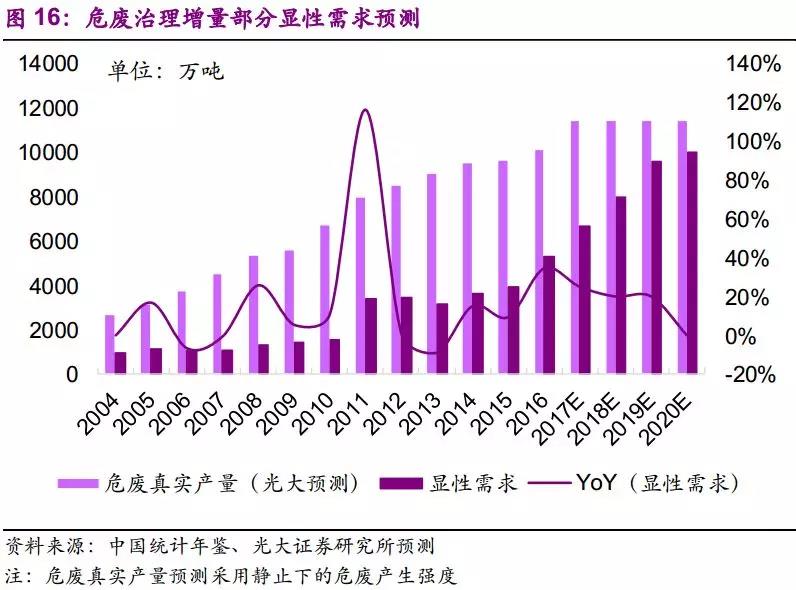 相比2016年危廢官方統(tǒng)計(jì)量增速34%,我們預(yù)測(cè)2017-2019年增速為30%、20%、20%,并于2019年達(dá)到峰值。1)在環(huán)保督察“回頭看”態(tài)勢(shì)不變,“清廢2018”等行動(dòng)直接針對(duì)固廢,加上《“十三五”全國(guó)危險(xiǎn)廢物規(guī)范化管理督查考核工作方案》的執(zhí)行,2017年官方統(tǒng)計(jì)量增速不會(huì)低于30%。2)隨著工業(yè)固廢排污許可制度的落地,顯性需求(即官方統(tǒng)計(jì)量)將逼近真實(shí)產(chǎn)量??紤]到實(shí)際操作,留出一部分差距。2017-2019年將會(huì)是危廢治理需求集中暴露時(shí)期。