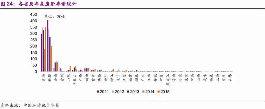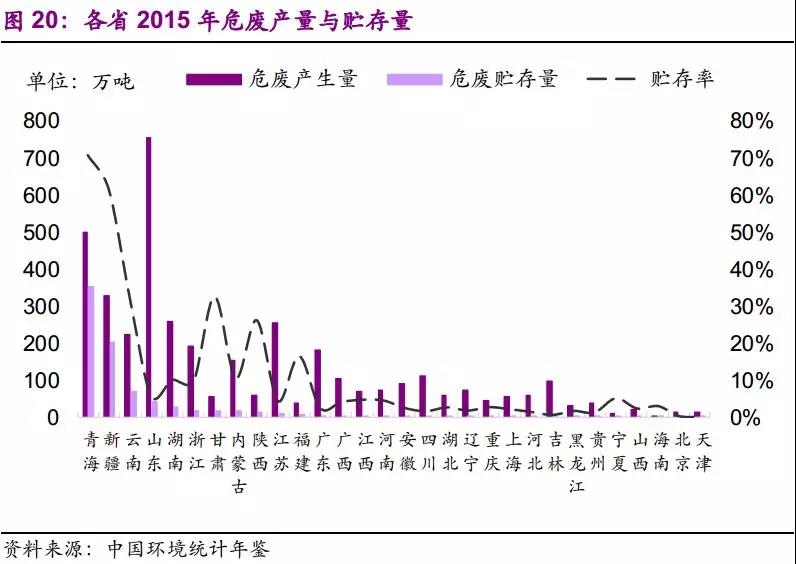 2015年,山東、青海、新疆、湖南、江蘇、云南六省危廢產(chǎn)量在200萬(wàn)噸以上,青海、新疆、甘肅、云南、陜西五省貯存率高于全國(guó)均值20%。