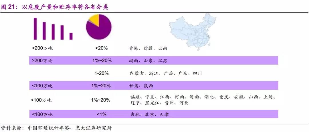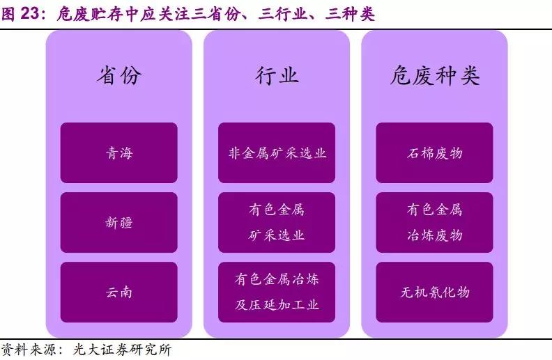 綜上,危廢貯存量應(yīng)關(guān)注的省份:青海、新疆、云南;應(yīng)關(guān)注的行業(yè):非金屬礦采選業(yè)、有色金屬礦采選業(yè)、有色金屬冶煉及壓延加工業(yè);應(yīng)關(guān)注的危廢種類:石棉廢物、無(wú)機(jī)氰化物、有色金屬冶煉廢物等。