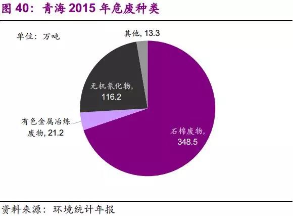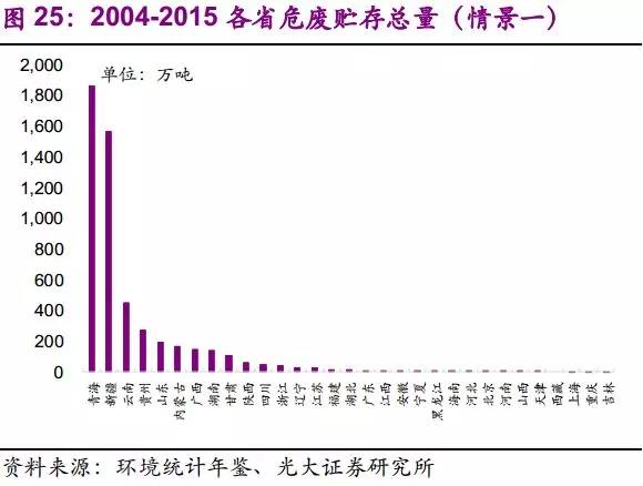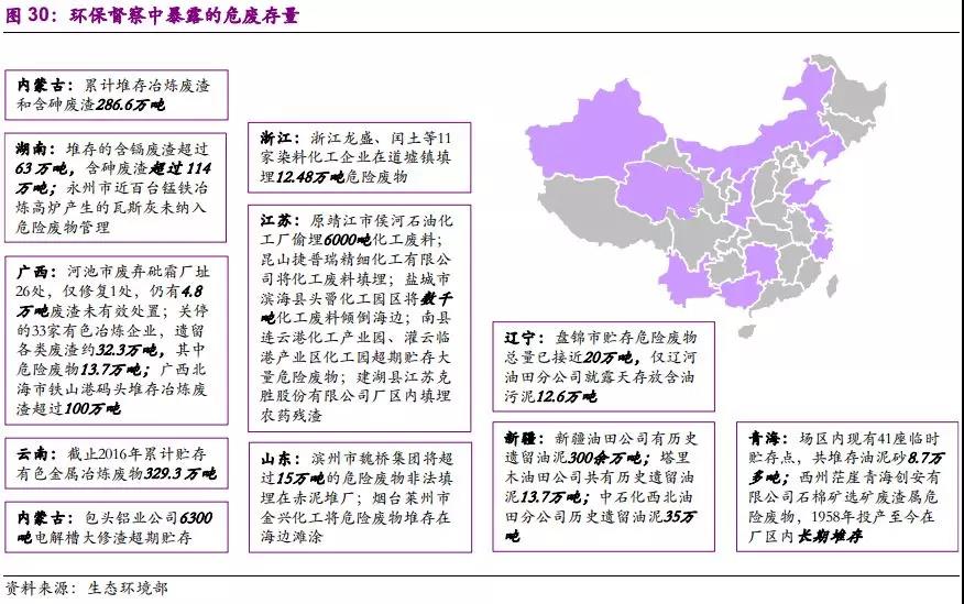 ◆存量部分:自上而下,歷史累積、自然消減和官方統(tǒng)計(jì)量差別三因素模型:假設(shè)年消減系數(shù)γ為0.7、0.8、0.9,則2004-2015年累計(jì)貯存總量分別為6847.9、13584.4、27201.3萬(wàn)噸。應(yīng)關(guān)注的省份:青海、新疆、云南;應(yīng)關(guān)注的行業(yè):非金屬礦采選業(yè)、有色金屬礦采選業(yè)、有色金屬冶煉及壓延加工業(yè);應(yīng)關(guān)注的危廢種類:石棉廢物、無(wú)機(jī)氰化物、有色金屬冶煉廢物等。自下而上,環(huán)保督察角度:危廢存量在“環(huán)保督察”中已大量暴露:在新疆、青海、云南等地,發(fā)現(xiàn)數(shù)百萬(wàn)噸的石棉、冶煉廢渣以及油泥,驗(yàn)證了我們前文提到的需關(guān)注行業(yè)和省份。
