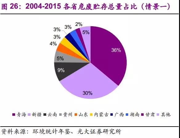 不考慮危廢官方統(tǒng)計(jì)量與實(shí)際產(chǎn)量的產(chǎn)別和危廢的自然消減,即將每年官方公布的貯存量簡(jiǎn)單加和,即得到危廢總貯存量?;谇榫耙坏募僭O(shè),青海、新疆成為危廢貯存絕對(duì)大省,占全國(guó)危廢貯存量的66%。