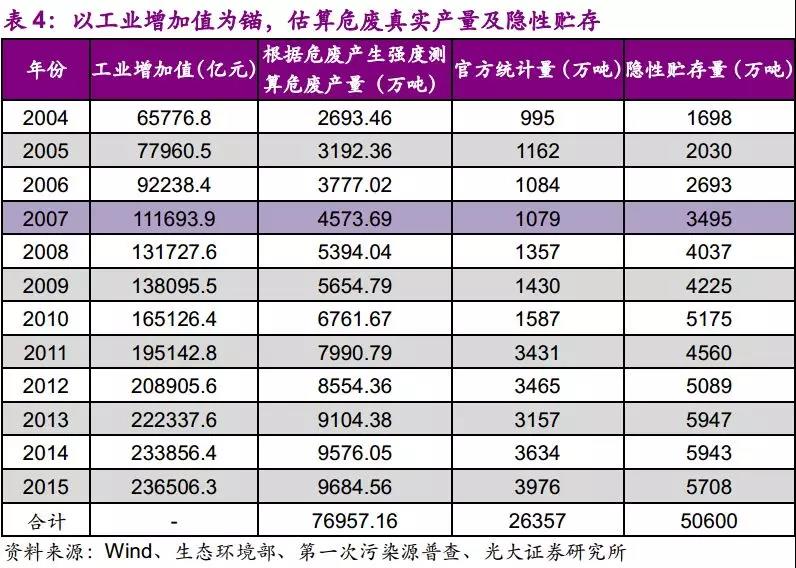 由于2007年第一次污染源普查中公布的危廢產(chǎn)量與當(dāng)年官方統(tǒng)計(jì)量存在差距,人們普遍認(rèn)為官方統(tǒng)計(jì)量與實(shí)際產(chǎn)量之間存在較大差距。原因在于當(dāng)前危廢自主申報(bào)制度下,環(huán)保壓力覆蓋面不足,導(dǎo)致大量企業(yè)瞞報(bào)漏報(bào)。假設(shè)未納入官方統(tǒng)計(jì)的危廢產(chǎn)量全部未經(jīng)處置自然堆存。同時(shí)以2007年污染源普查時(shí)期危廢產(chǎn)量為真實(shí)值,以工業(yè)增加值/危廢產(chǎn)量為比例系數(shù),估算其他年份危廢真實(shí)產(chǎn)量,從而得出危廢隱性貯存量。