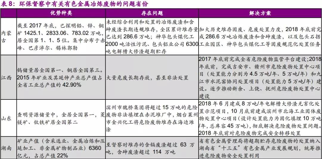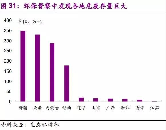 危廢存量問(wèn)題,尤其是重點(diǎn)地區(qū)的歷史遺留問(wèn)題,在前四輪“環(huán)保督察”中已大量暴露。在新疆、青海、云南等地,發(fā)現(xiàn)數(shù)百萬(wàn)噸的石棉、冶煉廢渣以及油泥,驗(yàn)證了我們前文提到的需關(guān)注行業(yè)和省份。