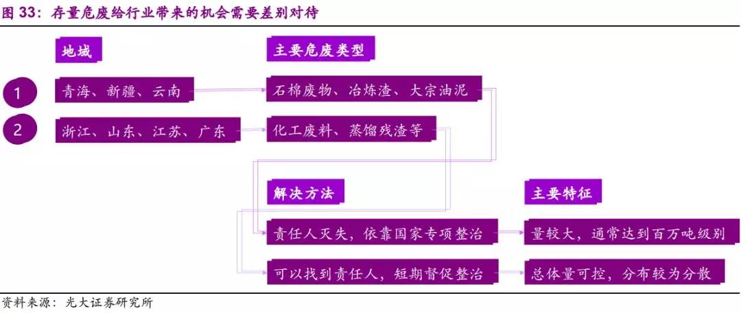 ◆結(jié)構(gòu)性機(jī)會(huì):積極而有區(qū)別的對(duì)待。增量部分:增量市場(chǎng)中顯性需求在2017-2019年增速為30%、20%、20%,并于2019年達(dá)到峰值。存量部分:應(yīng)密切關(guān)注各地歷史遺留問(wèn)題的解決方案和推進(jìn)進(jìn)度。四種典型歷史遺留危廢的治理進(jìn)度為:油泥>無(wú)機(jī)氰化物>有色金屬冶煉廢物>石棉廢物。