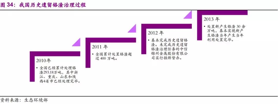 2005年,發(fā)改委發(fā)布《鉻渣污染綜合整治方案》,啟動(dòng)對(duì)全國(guó)堆存的410萬(wàn)噸鉻渣進(jìn)行處置。要求2008年底前,完成環(huán)境敏感區(qū)域堆存鉻渣無(wú)害化處置,2010年底前,所有歷史堆存鉻渣實(shí)現(xiàn)無(wú)害化處置。根據(jù)《“十三五”生態(tài)環(huán)境保護(hù)規(guī)劃的通知》,截至2015年,歷史遺留的670萬(wàn)噸鉻渣全部處置完畢。