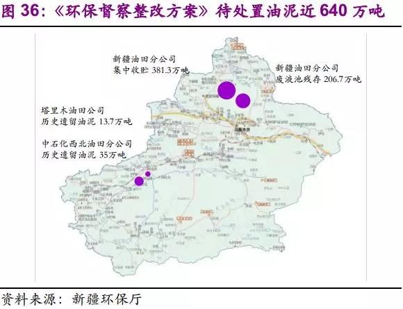 從督察情況來(lái)看,在黑龍江、山東、陜西、新疆、天津五個(gè)產(chǎn)油大省中,新疆的油泥貯存問(wèn)題最為嚴(yán)重。2018年5月,《新疆維吾爾自治區(qū)貫徹落實(shí)中央第八環(huán)境保護(hù)督察組督察反饋意見整改方案》顯示,新疆油田公司有歷史遺留油泥300余萬(wàn)噸亟待規(guī)范化處置(問(wèn)題編號(hào):九十),塔里木油田公司、西北油田公司有大量歷史遺留油泥亟待規(guī)范化處置(問(wèn)題編號(hào):九十一)。而根據(jù)整改方案內(nèi)容,待處置的油泥貯存量近640萬(wàn)噸。根據(jù)《整改方案》規(guī)劃,共計(jì)分為5個(gè)時(shí)間節(jié)點(diǎn),截至2020年底,將634.5萬(wàn)噸歷史遺留油泥處理完畢。