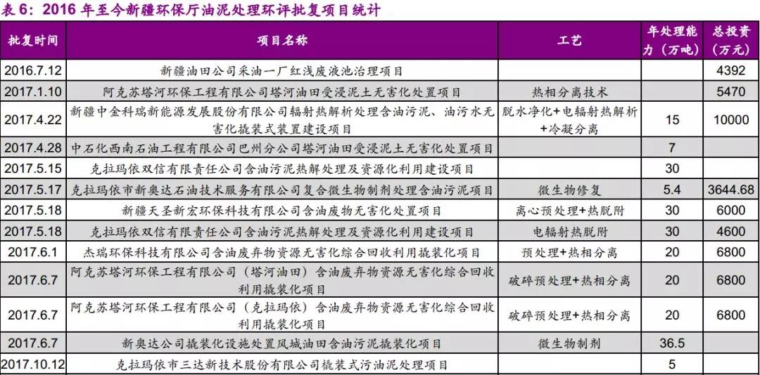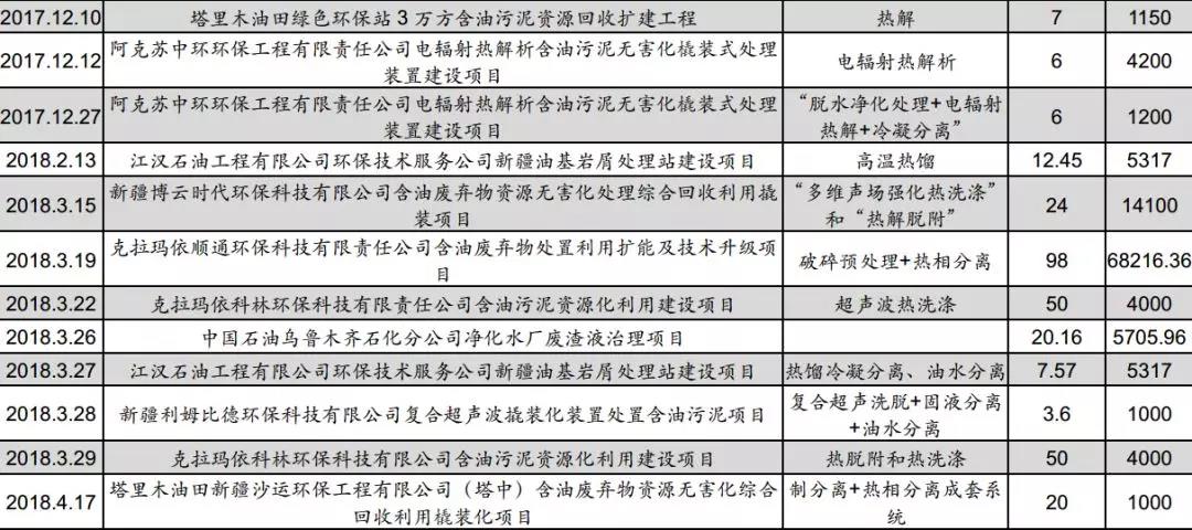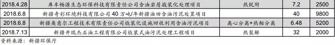 存量油泥的的治理蘊(yùn)藏巨大機(jī)會(huì)。相比其他危險(xiǎn)廢物,油泥的利用價(jià)值相對(duì)較高。從新疆環(huán)保廳環(huán)評(píng)批復(fù)情況來(lái)看,新疆油泥處理正迎來(lái)一波投資熱潮。僅對(duì)2016年至今環(huán)評(píng)批復(fù)項(xiàng)目進(jìn)行統(tǒng)計(jì),共有31個(gè)第三方油泥治理項(xiàng)目,總投資超過(guò)19億元,全部建成后將形成621萬(wàn)噸/年的油泥處理能力。