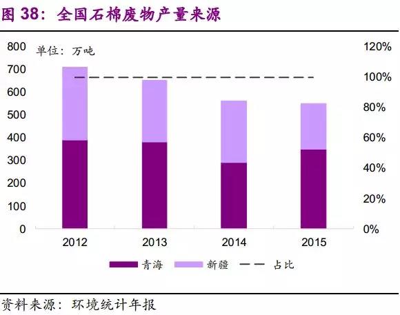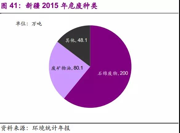在新疆、青海兩省危廢總產(chǎn)量中,石棉占據(jù)了絕對(duì)優(yōu)勢(shì)地位。其中青海危廢產(chǎn)量中,石棉廢物2015年產(chǎn)量348.5萬(wàn)噸,占比近70%。新疆危廢總產(chǎn)量中,石棉廢物2015年產(chǎn)量200萬(wàn)噸,占比近61%。