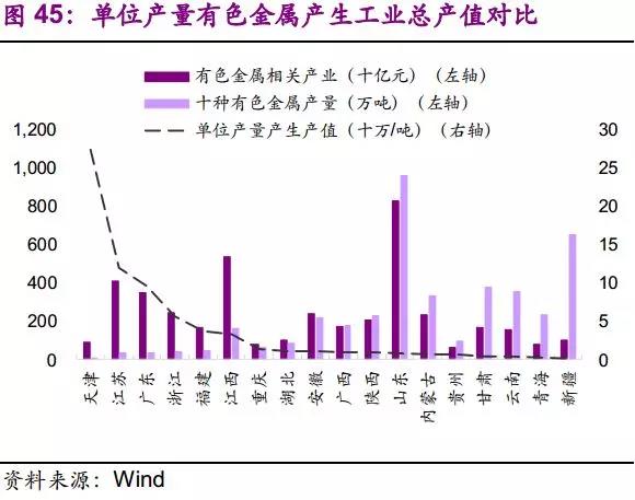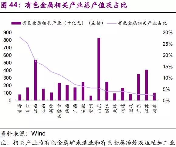 針對(duì)本次環(huán)保督察中有色金屬冶煉廢物存量較大的省份,我們發(fā)現(xiàn)兩大特點(diǎn)。1)有色金屬相關(guān)產(chǎn)業(yè)總產(chǎn)值占工業(yè)總產(chǎn)值比重較大。如甘肅、江西、青海、云南等地,占比均在10%以上。2)單位產(chǎn)量有色金屬產(chǎn)生工業(yè)總產(chǎn)值較低。如內(nèi)蒙古、貴州、甘肅、云南、青海、新疆,每噸總產(chǎn)值均低于7萬(wàn)元。