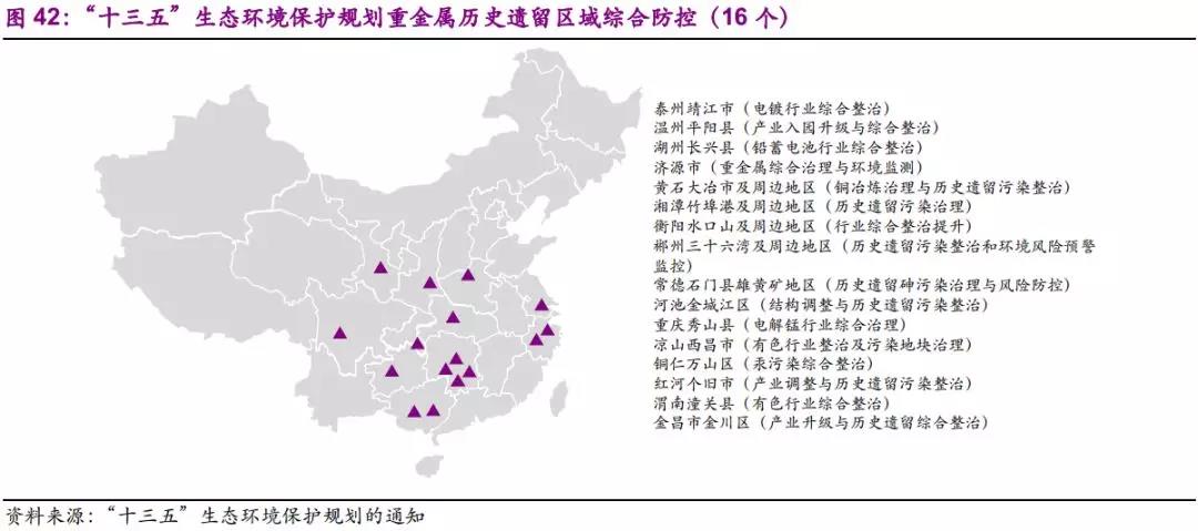 “十三五”期間,我國(guó)繼續(xù)加強(qiáng)對(duì)重金屬區(qū)域綜合防控和流域綜合整治。其中湖州長(zhǎng)興縣(鉛蓄電池行業(yè)綜合整治)、湘潭竹埠港及周邊地區(qū)(歷史遺留污染治理)、衡陽(yáng)水口山及周邊地區(qū)(行業(yè)綜合整治提升)、紅河個(gè)舊市(產(chǎn)業(yè)調(diào)整與歷史遺留污染整治)等歷史遺留問(wèn)題位列其中。