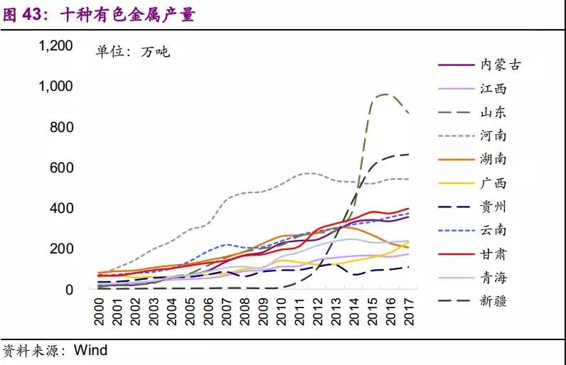 從十種有色金屬產(chǎn)量來(lái)看,有色金屬產(chǎn)地與有色金屬礦產(chǎn)地出現(xiàn)一定偏差。如近幾年有色金屬產(chǎn)量快速上升的新疆、山東,并非有色金屬儲(chǔ)量大省。原因可能在于電價(jià)優(yōu)勢(shì)引發(fā)電解鋁產(chǎn)能快速擴(kuò)張。而西南地區(qū)有色金屬大省,如貴州、云南、湖南等省份,有色金屬產(chǎn)量增加相對(duì)較為緩慢。