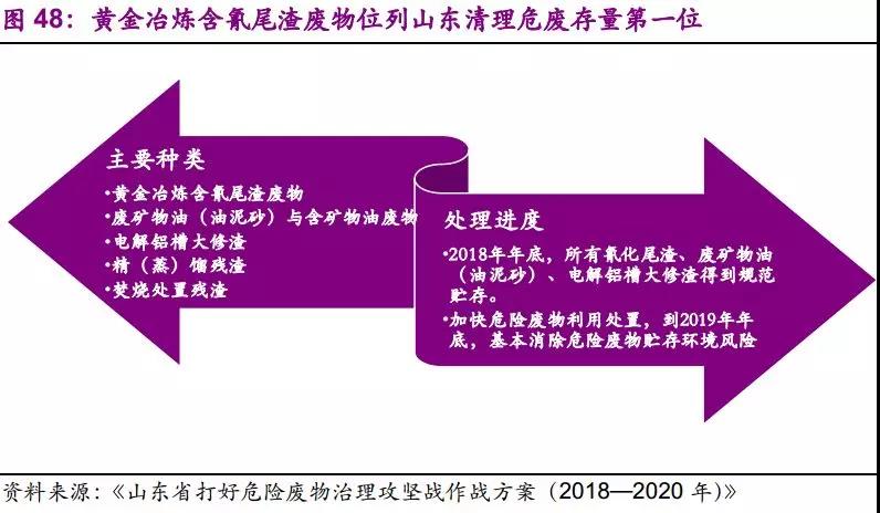 無(wú)機(jī)氰化物存量清理已拉開序幕,利好危廢焚燒企業(yè)及水泥窯協(xié)同處置企業(yè)。2018年8月8日,山東省人民政府印發(fā)《山東省打好危險(xiǎn)廢物治理攻堅(jiān)戰(zhàn)作戰(zhàn)方案(2018—2020年)》,提出加快清理危險(xiǎn)廢物存量。針對(duì)黃金冶煉含氰尾渣廢物、廢礦物油(油泥砂)與含礦物油廢物、電解鋁槽大修渣、精(蒸)餾殘?jiān)⒎贌幹脷堅(jiān)乳L(zhǎng)期大量貯存的危險(xiǎn)廢物,建立管理臺(tái)賬,督促各市加快清理進(jìn)度。在山東省存量危廢中,黃金冶煉含氰尾渣廢物和廢礦物油(油泥砂)與含礦物油廢物分別居第一、二位。
