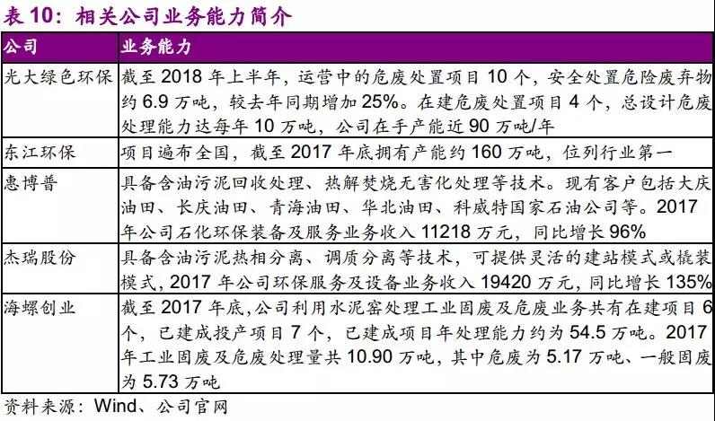 我們認(rèn)為行業(yè)當(dāng)前面臨存量和增量雙層疊加,具備高景氣度。根據(jù)我們預(yù)測(cè),2017-2019年將會(huì)是危廢治理顯性需求集中暴露時(shí)期,且存量部分已進(jìn)入整治方案,未來(lái)治理加速。針對(duì)增量暴露并逐步接近真實(shí)產(chǎn)量下的機(jī)會(huì),具備規(guī)模優(yōu)勢(shì)和優(yōu)異運(yùn)營(yíng)能力的公司將有望在新一輪跑馬圈地中脫穎而出,建議關(guān)注光大綠色環(huán)保(H)、東江環(huán)保(A+H);針對(duì)存量整治下的機(jī)會(huì),建議關(guān)注油泥治理:惠博普、杰瑞股份;水泥窯協(xié)同氰化物治理:海螺創(chuàng)業(yè)(H)。