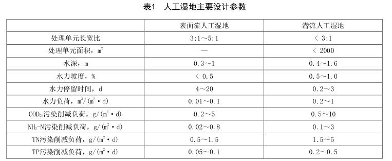 4.4.1.1人工濕地主要設(shè)計參數(shù)宜根據(jù)試驗資料確定,無試驗資料時,可參考表1確定。