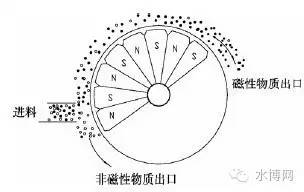 含有磁粉和污泥的污水從轉鼓的一端進入分離裝置,固定磁極將磁性顆粒吸出并附著在滾筒表面,隨著滾筒的轉動,被帶至磁系邊緣的低磁區(qū),并從磁性物質出口卸下,非磁性物質則在重力的作用下,沿分離槽流至非磁性物質出口排出,完成磁性物質和非磁性物質的分離過程。