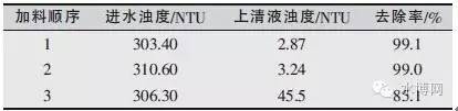 保持其他工況不變分別試驗以下3種加料順序對磁絮凝反應的影響。①先加PAC,再加入磁粉,然后加PAM;②同時加入磁粉和PAC,然后加PAM;③先加PAC,再加PAM,最后加磁粉。其中每種物料的投加間隔時間為2min。針對以上3種加料順序分別測試上清液的濁度,結果列于表2。