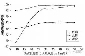 保持其他參數(shù)不變,將PAM投加質量濃度恒定,調節(jié)PAC的投加量(以Al2O3計),分別測試各種加藥量下的COD、總磷及濁度指標,并計算出各項污染物的去除率,將試驗結果繪于圖3中。