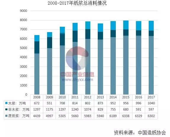 2017年全國(guó)紙漿消耗總量10051萬(wàn)噸,較上年增長(zhǎng)2.59%。木漿3152萬(wàn)噸,占紙漿消耗總量31%,其中進(jìn)口木漿占21%、國(guó)產(chǎn)木漿占10%;廢紙漿6302萬(wàn)噸,占紙漿消耗總量63%,其中用進(jìn)口廢紙制漿占21%、用國(guó)產(chǎn)廢紙制漿占42%;非木漿597萬(wàn)噸,占紙漿消耗總量6%。
