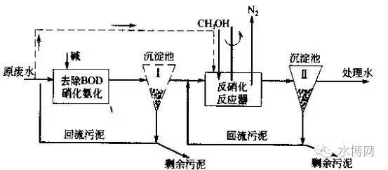 如果將有機(jī)物去除和硝化放在同一個反應(yīng)器中進(jìn)行,而將反硝化作用放在另一個反應(yīng)器中進(jìn)行,則可以將三級生物脫氮系統(tǒng)簡化為兩級生物脫氮系統(tǒng)。如下圖: