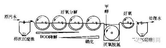 該工藝的脫氮原理是:由于降解有機(jī)物的好氧氧化菌的生長繁殖優(yōu)先于硝化菌與亞硝化菌,因此,在前兩級轉(zhuǎn)盤上去除有機(jī)物的能力較強(qiáng),而后兩級能夠產(chǎn)生比較充分的硝化反應(yīng),形成硝酸鹽氮和亞硝酸鹽氮。由于轉(zhuǎn)盤低速旋轉(zhuǎn)的傳質(zhì)作用.這些硝態(tài)氮隨污水進(jìn)人處于厭氧狀態(tài)的淹沒式轉(zhuǎn)盤時,與外加甲醇充分接觸,進(jìn)行反硝化脫氮反應(yīng)。而殘留下來的甲醇再經(jīng)過好氧生物轉(zhuǎn)盤的處理后得到去除。