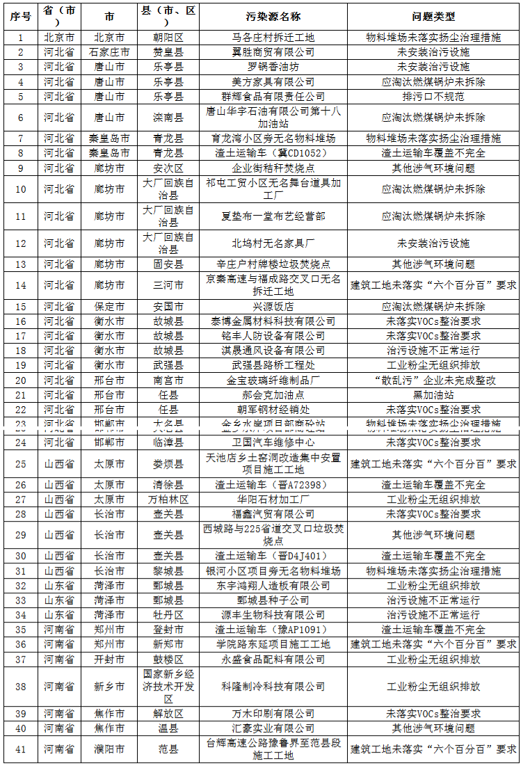 9月12日,2018-2019年藍天保衛(wèi)戰(zhàn)重點區(qū)域強化督查工作繼續(xù)開展,其中200個督查組對京津冀及周邊地區(qū)的139個縣(市、區(qū))進行督查、核查工作,發(fā)現(xiàn)涉氣環(huán)境問題41個(見附件),核查點位1100個,如下: