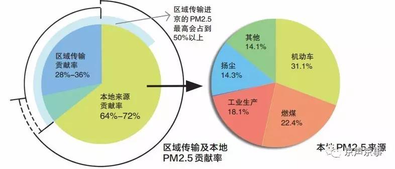 2014年4月,北京正式發(fā)布PM2.5來源解析最新研究成果:全年P(guān)M2.5來源中,區(qū)域傳輸貢獻(xiàn)約占28%至36%,本地污染排放貢獻(xiàn)占64%至72%。在本地污染貢獻(xiàn)中,機動車排放比例最高,達(dá)31.1%。一些特定空氣重污染過程中,通過區(qū)域傳輸進(jìn)京的PM2.5會占到總量的50%以上。