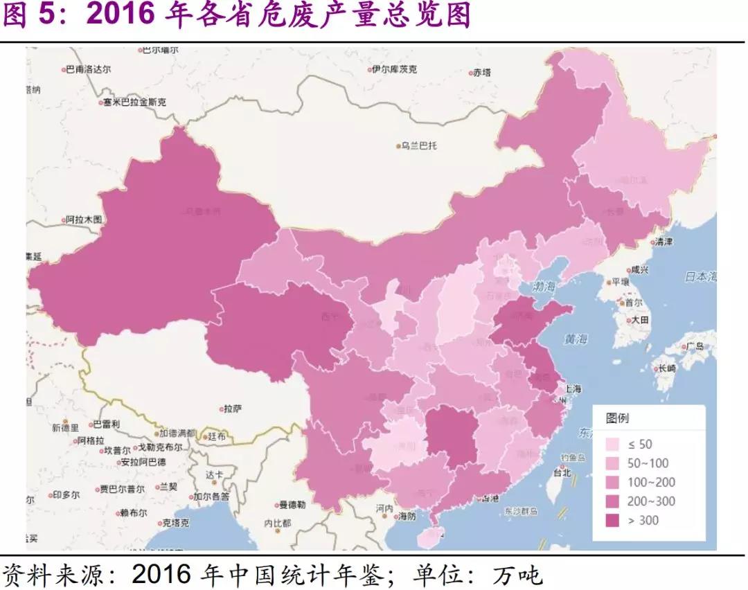 2016年危廢產(chǎn)生統(tǒng)計(jì)量增速較快、覆蓋越來(lái)越全面。2015-2016年,全國(guó)危廢產(chǎn)量由3976.11萬(wàn)噸上升至5347.3萬(wàn)噸,增速達(dá)35%。高增速一方面包含各行業(yè)產(chǎn)廢自然增速,另一方面也涵蓋了環(huán)保壓力下先前統(tǒng)計(jì)缺失的補(bǔ)足。