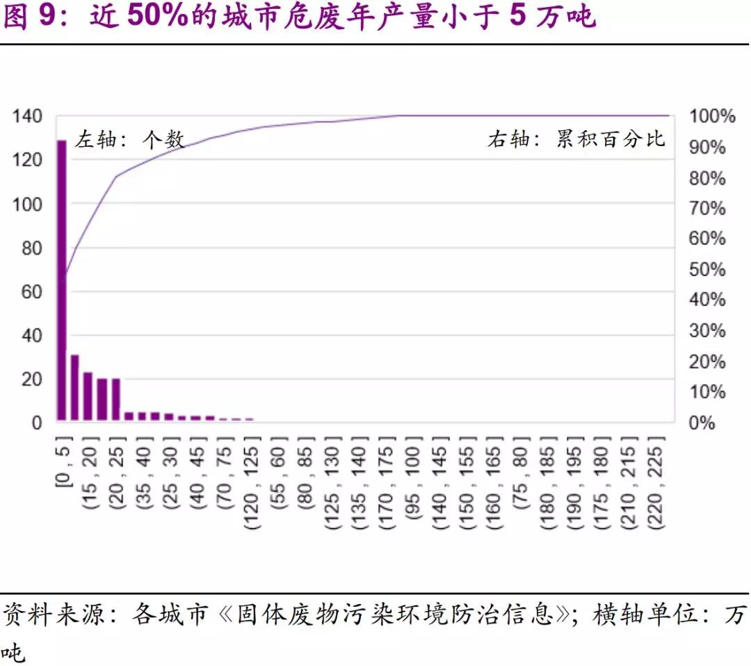 分市來(lái)看,近50%的城市危廢產(chǎn)量小于5萬(wàn)噸,整體呈現(xiàn)“長(zhǎng)尾效應(yīng)”。我們對(duì)比了發(fā)布的2016-2017年《固體廢物污染環(huán)境防治信息》的城市產(chǎn)生情況,整體產(chǎn)廢大市集中在京津冀-山東、長(zhǎng)三角、遼沈一帶、西南重工業(yè)區(qū)等地域。從產(chǎn)量分布來(lái)看,近50%的城市危廢產(chǎn)量小于5萬(wàn)噸,其余城市則分布在5 -225萬(wàn)噸的眾多區(qū)間,整體呈現(xiàn)“長(zhǎng)尾效應(yīng)”。