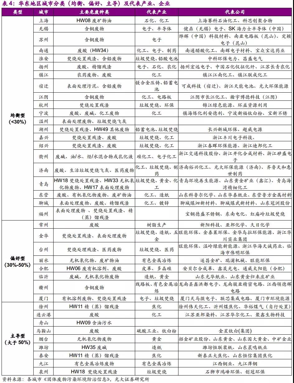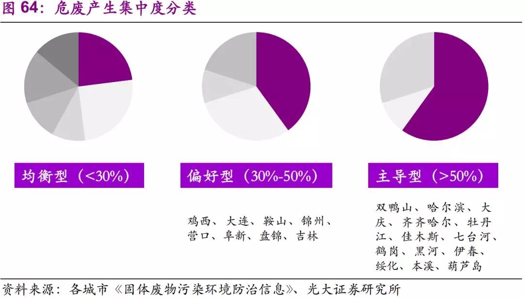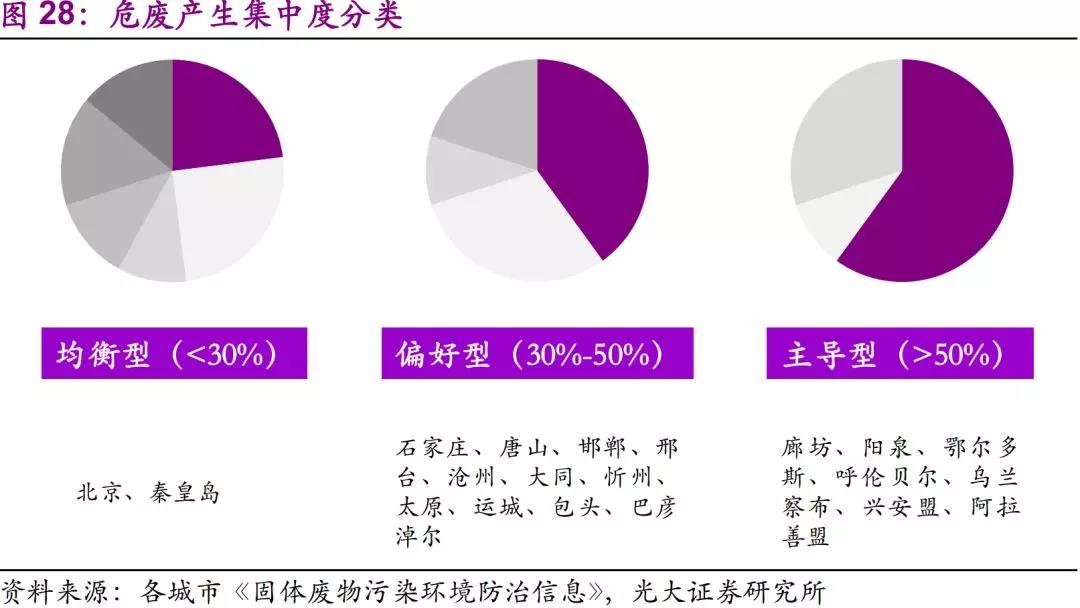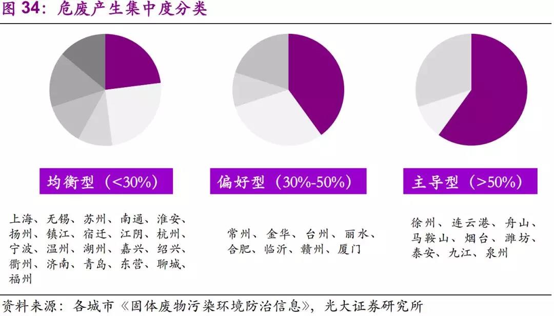 從2017年各市危廢增速來(lái)看,東部沿海地區(qū)延續(xù)高景氣度。從危廢種類和產(chǎn)廢企業(yè)集中度來(lái)看,東部地區(qū)種類更復(fù)雜,處理工藝要求更高。從城市分類來(lái)看,均衡型城市處置需求最為復(fù)雜。