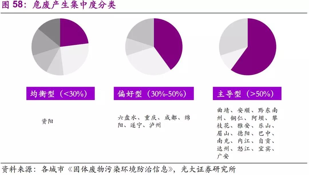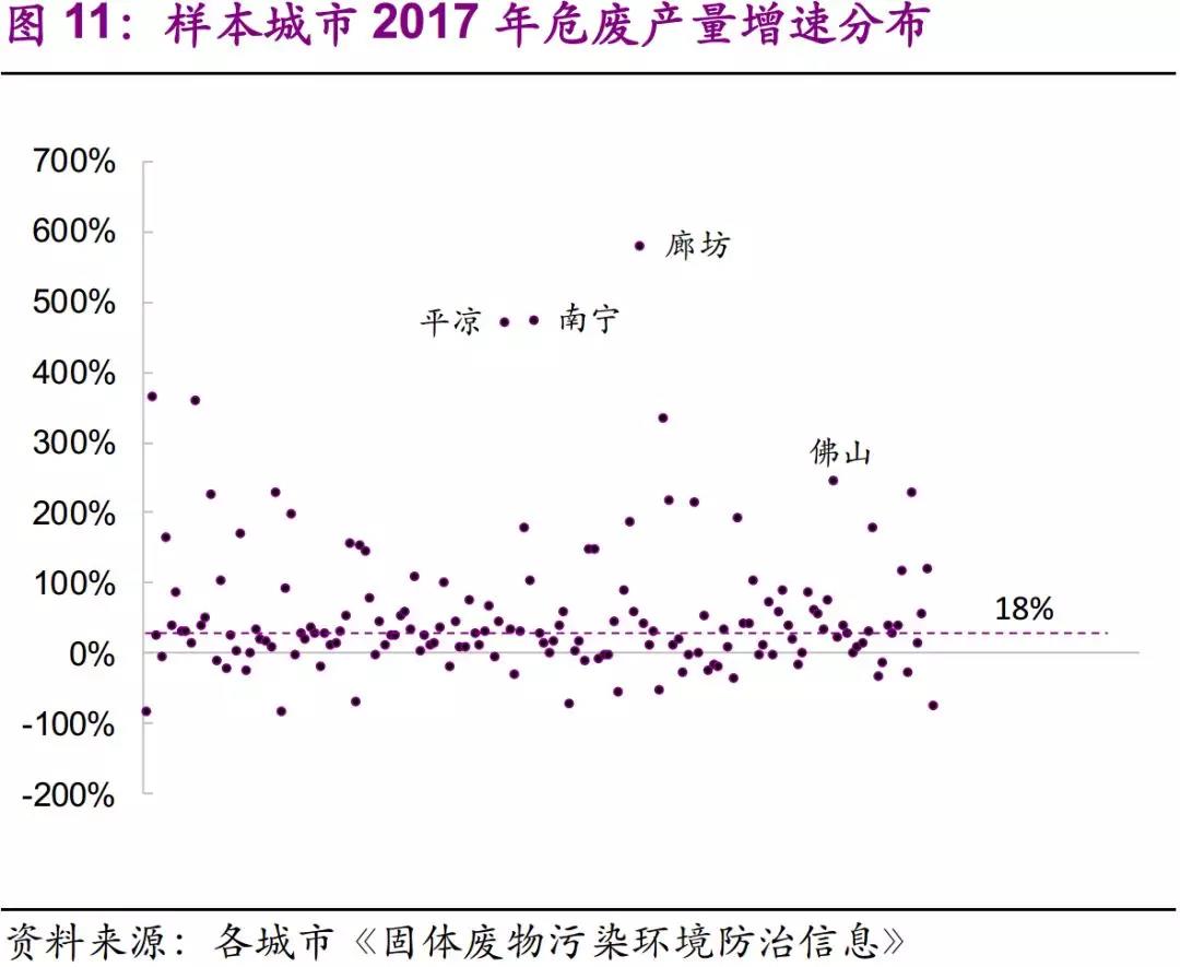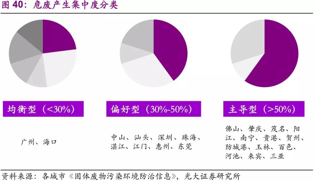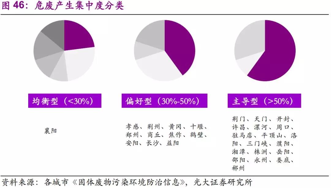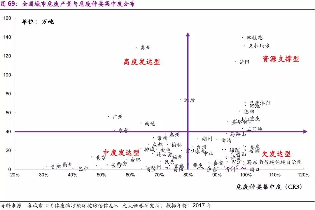 從2017年各市危廢增速來(lái)看,東部沿海地區(qū)延續(xù)高景氣度。從危廢種類和產(chǎn)廢企業(yè)集中度來(lái)看,東部地區(qū)種類更復(fù)雜,處理工藝要求更高。從城市分類來(lái)看,均衡型城市處置需求最為復(fù)雜。