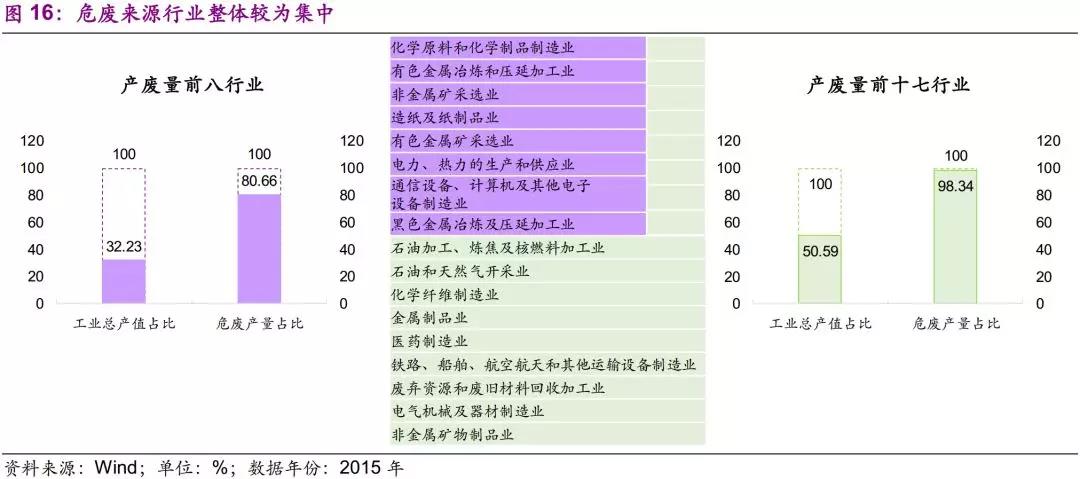 危廢產(chǎn)生行業(yè)較為集中。在國(guó)家統(tǒng)計(jì)常用40個(gè)行業(yè)中,危廢產(chǎn)量前8的行業(yè)危廢產(chǎn)生量占比達(dá)80.66%,前17的行業(yè)占比達(dá)98.34%;而相應(yīng)的工業(yè)總產(chǎn)值占比分別為32.23%和50.59%。