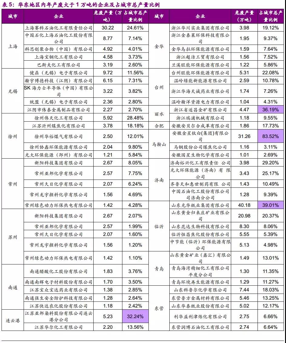 華東地區(qū)產(chǎn)廢大市集中于長(zhǎng)三角及山東地區(qū)。華東地區(qū)產(chǎn)業(yè)結(jié)構(gòu)較為完善,因此,各個(gè)城市對(duì)利用和處置產(chǎn)能的需求較為均衡。