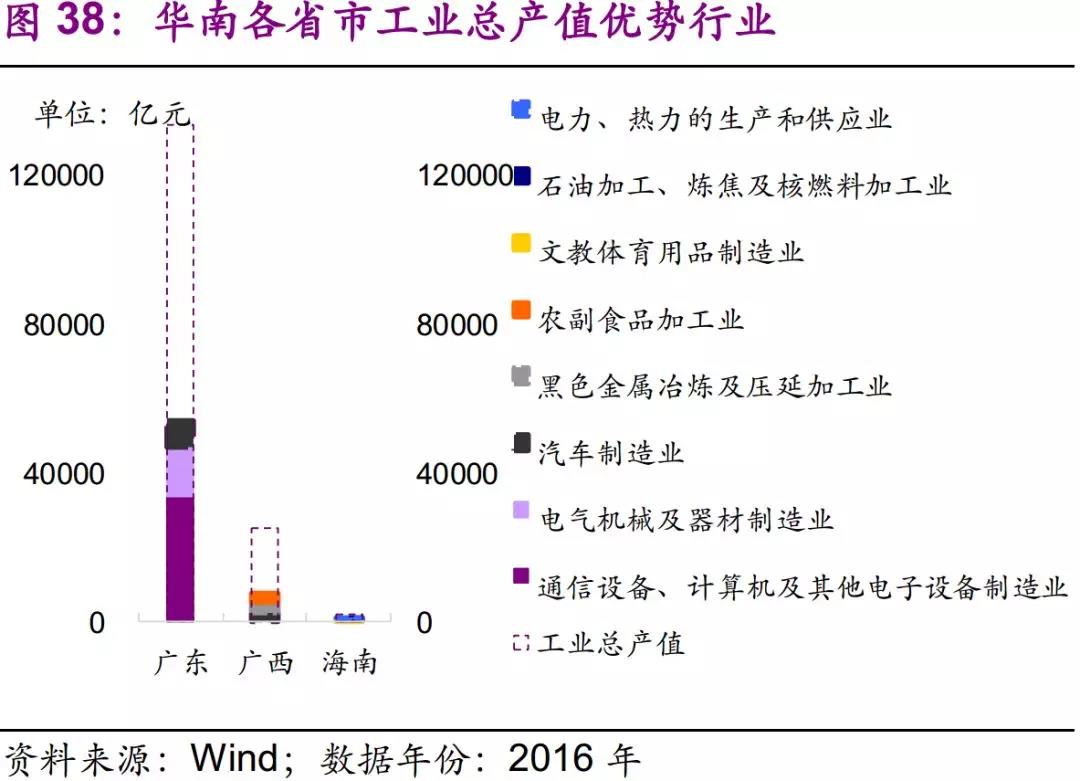 從全行業(yè)來(lái)看,廣東、廣西、海南優(yōu)勢(shì)產(chǎn)業(yè)分別為通信設(shè)備、計(jì)算機(jī)及其他電子設(shè)備制造業(yè)、汽車制造業(yè)和文教體育用品制造業(yè)。