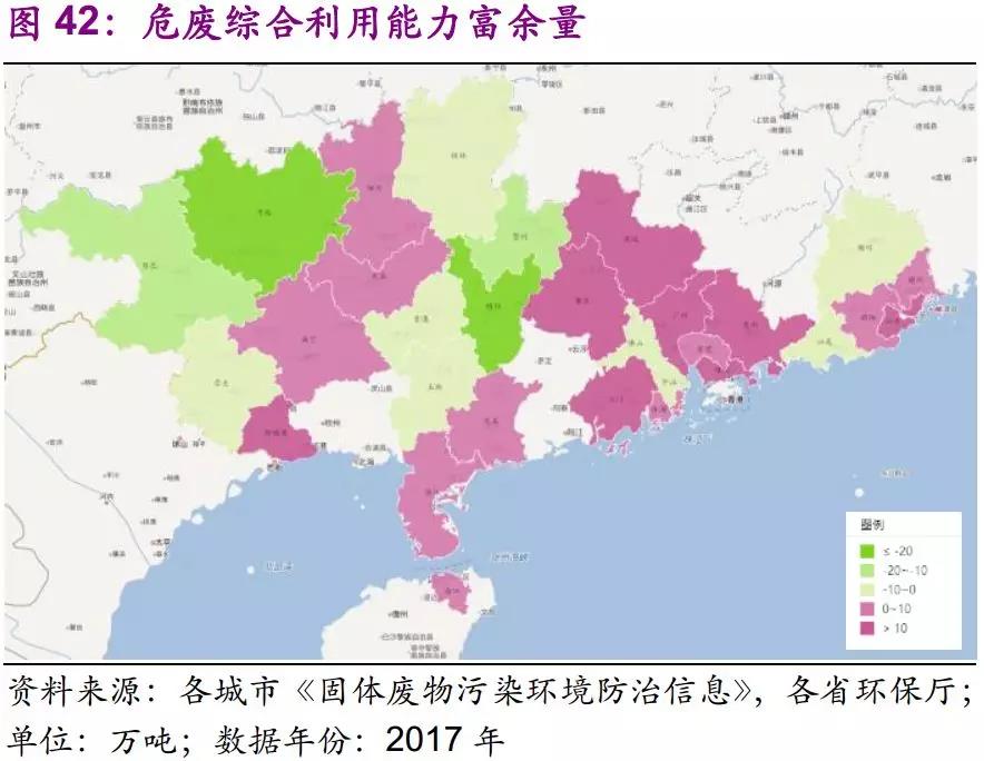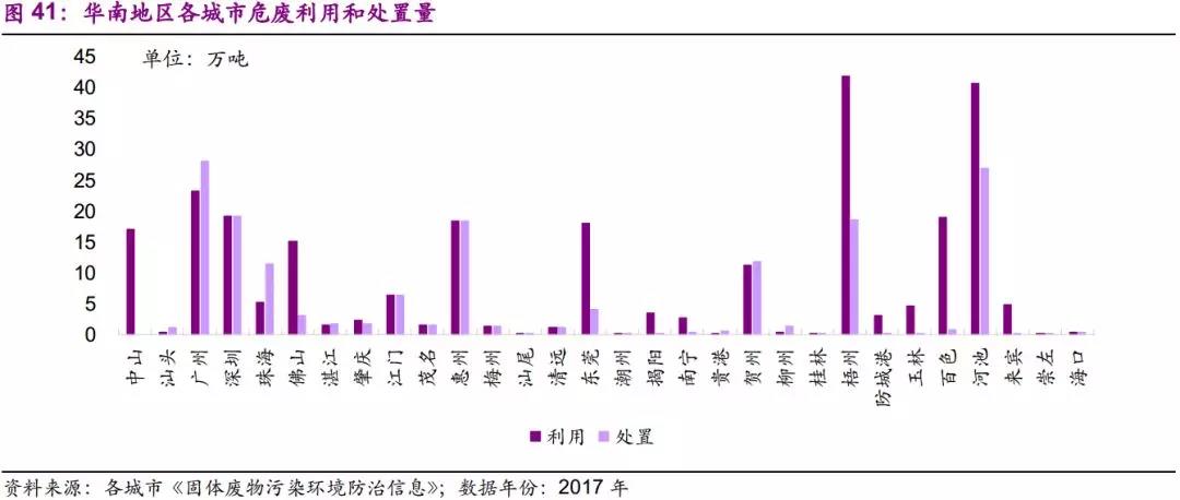 廣東省利用能力嚴(yán)重過(guò)剩,處置能力缺乏;廣西城市間差別較大??赡茉蛟谟谕ㄐ旁O(shè)備、計(jì)算機(jī)及其他電子設(shè)備制造業(yè)所產(chǎn)生的危廢利用價(jià)值較高,資源化產(chǎn)能自發(fā)建造較多,而無(wú)害化產(chǎn)能建設(shè)相對(duì)滯后。而廣西多數(shù)城市危廢種類較為單一,產(chǎn)廢量巨大,而工業(yè)總產(chǎn)值卻不高。城市間產(chǎn)能的差別可能與具體冶煉金屬種類有關(guān)。