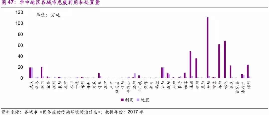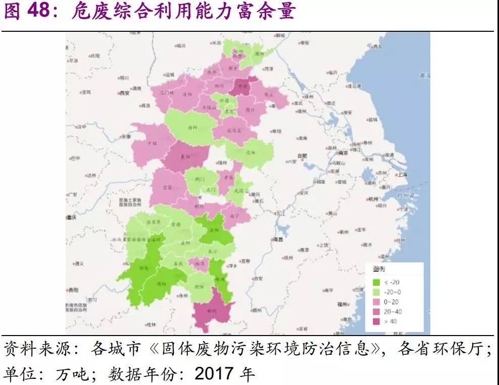 河南省利用產(chǎn)能過(guò)剩,處置產(chǎn)能短缺;湖北省整體平衡;湖南省利用產(chǎn)能短缺,利用產(chǎn)能短缺更多。從產(chǎn)能富余情況來(lái)看,河南省中部地區(qū)產(chǎn)能較為富余,南部地區(qū)產(chǎn)能普遍短缺。而湖北省則整體實(shí)現(xiàn)利用和處置產(chǎn)能匹配;而湖南省兩種產(chǎn)能都處于短缺狀態(tài),尤其在岳陽(yáng)、邵陽(yáng)、株洲等主導(dǎo)型城市最為嚴(yán)重。短缺的主要原因在于,實(shí)際利用和處置量遠(yuǎn)大于核準(zhǔn)產(chǎn)能。我們認(rèn)為,深層次原因在于,企業(yè)內(nèi)部處理的危廢量較多,對(duì)外部處置產(chǎn)能的需求相對(duì)較小。