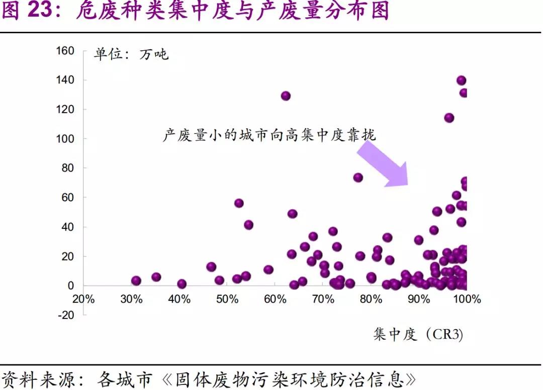 集中度高的影響:1)產(chǎn)廢企業(yè)產(chǎn)值占比較大,抗環(huán)保整治能力較強(qiáng),與政府有較強(qiáng)的話語(yǔ)權(quán);2)工業(yè)結(jié)構(gòu)較為單一,處置搭配簡(jiǎn)單、單價(jià)低。