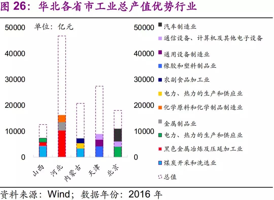 1)京津冀地區(qū)。大氣治理壓力下,重污染企業(yè)限產(chǎn)、停產(chǎn)較多,同時(shí)高污染重工業(yè)逐步外遷。2016年工業(yè)總產(chǎn)值中,北京市和天津市優(yōu)勢(shì)產(chǎn)業(yè)分別為汽車制造業(yè)和橡膠和塑料制品業(yè)。