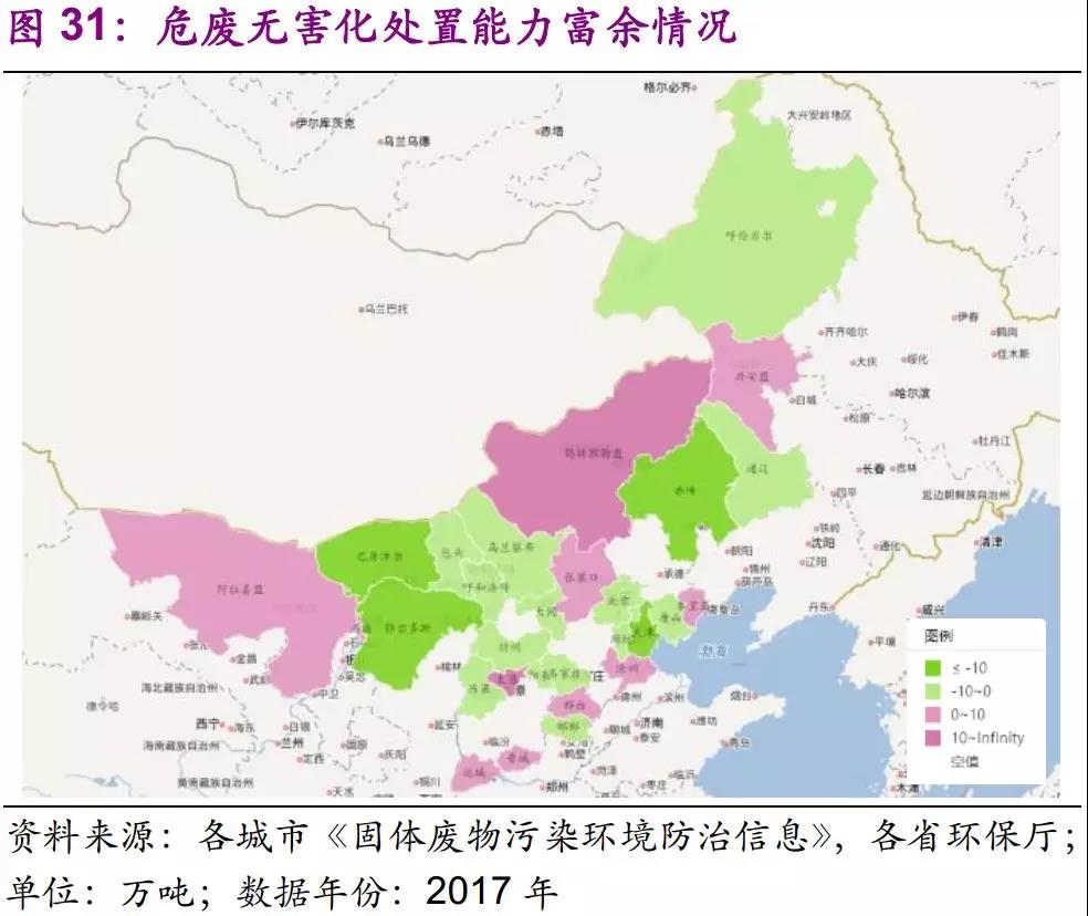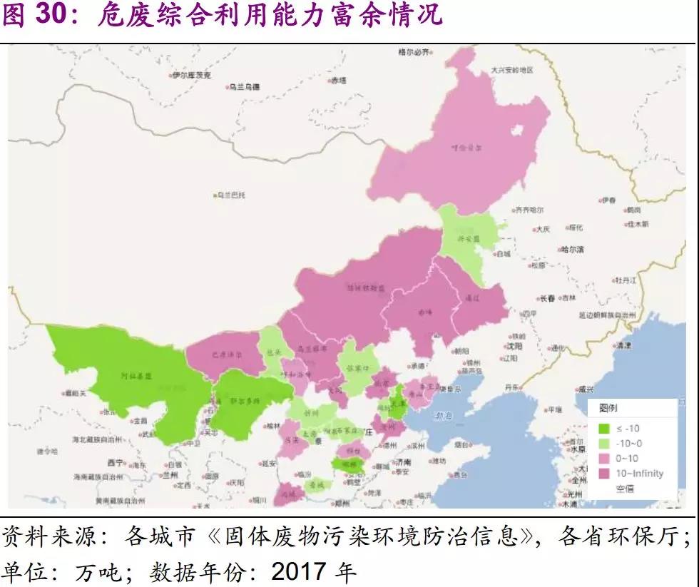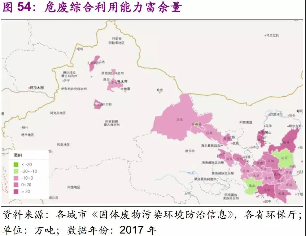 將各城市危廢利用、處置量與相應(yīng)資質(zhì)對(duì)比,可以得到相應(yīng)地區(qū)利用和處理能力的短缺和富余情況。以內(nèi)蒙古為例,可以看到利用能力相對(duì)充足,處置能力則相對(duì)短缺。如赤峰市,經(jīng)我們測(cè)算,2017年利用能力富余51萬(wàn)噸,處置能力則短缺26萬(wàn)噸。