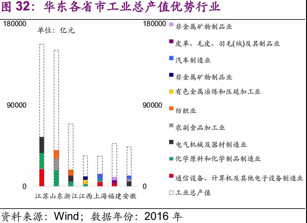 從全行業(yè)來(lái)看,江蘇、福建優(yōu)勢(shì)產(chǎn)業(yè)為通信設(shè)備、計(jì)算機(jī)及其他電子設(shè)備制造業(yè);浙江、安徽優(yōu)勢(shì)產(chǎn)業(yè)為電氣機(jī)械及器材制造業(yè);山東、江西、上海優(yōu)勢(shì)產(chǎn)業(yè)分別為化學(xué)原料和化學(xué)制品制造業(yè)、有色金屬冶煉和壓延加工業(yè)和汽車制造業(yè)。