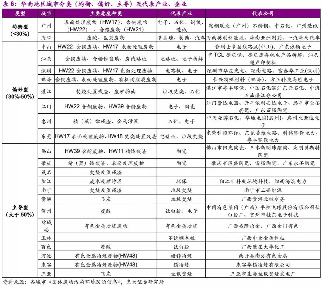 華南地區(qū)呈現(xiàn)鮮明的產(chǎn)業(yè)主導(dǎo)性。廣東省通信設(shè)備、計(jì)算機(jī)及其他電子設(shè)備制造業(yè)發(fā)達(dá),同時(shí)其他行業(yè)也有發(fā)展,因此多為偏好型城市,且城市間危廢產(chǎn)量差距不大。而廣西省有色金屬冶煉產(chǎn)業(yè)發(fā)達(dá),如來(lái)賓的錫冶煉、河池的鉛鋅冶煉、百色的鈦白粉產(chǎn)業(yè),龍頭公司危廢產(chǎn)量占城市危廢總產(chǎn)量均超過(guò)50%。