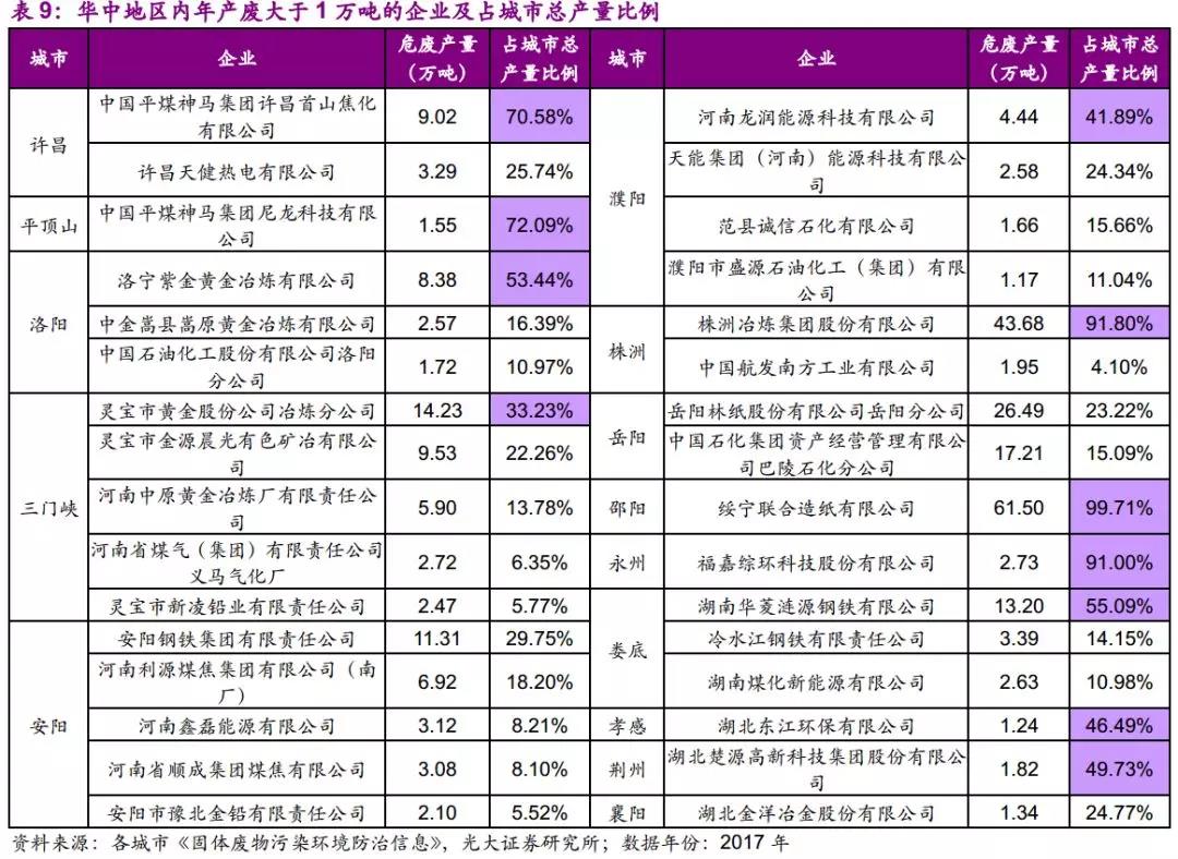 華中地區(qū)主導(dǎo)型城市較多。產(chǎn)廢量占城市危廢產(chǎn)量比重比較大的企業(yè)有許昌中國(guó)平煤神馬集團(tuán)許昌首山焦化有限公司(71%)、平頂山中國(guó)平煤神馬集團(tuán)尼龍科技有限公司(72%)、株洲冶煉集團(tuán)股份有限公司(92%)、邵陽(yáng)綏寧聯(lián)合造紙有限公司(100%)、永州福嘉綜環(huán)科技股份有限公司(91%)。