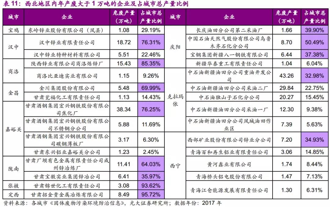 西北地區(qū)城市產(chǎn)業(yè)結(jié)構(gòu)較為單一,以主導(dǎo)型城市為主。主要產(chǎn)業(yè)有:1)石油和天然氣開采,如延安、慶陽(yáng)、克拉瑪依;2)有色冶煉,如漢中、商洛、隴南、西寧;3)焦化及煤化工,如渭南、嘉峪關(guān)、韓城。產(chǎn)廢量占所在城市產(chǎn)廢量比例較大的企業(yè)有:漢中鋅業(yè)有限責(zé)任公司(76%)、商洛陜西鋅業(yè)有限公司商洛煉鋅廠(85%)、嘉峪關(guān)甘肅酒鋼集團(tuán)宏興鋼鐵股份有限公司焦化廠(76%)、定西甘肅招金貴金屬冶煉有限公司(96%)。