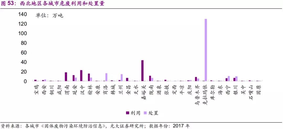 陜西整體產(chǎn)能過(guò)剩,甘肅、寧夏、新疆則利用產(chǎn)能過(guò)剩,處置產(chǎn)能不足。陜西北部以石油和天然氣開采為主,南部有色冶煉發(fā)達(dá),中部地區(qū)則以焦化、電子產(chǎn)業(yè)為主,整體上利用和處置產(chǎn)能均較為充足。甘肅北部以醫(yī)藥、石化產(chǎn)業(yè)為主,南部則為有色冶煉,整體上無(wú)害化處置產(chǎn)能較為稀缺。新疆地區(qū)克拉瑪依危廢產(chǎn)量在120萬(wàn)噸以上,主要是廢礦物油和廢堿,公告顯示以焚燒處置為主。