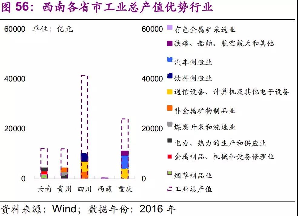 從全行業(yè)來(lái)看,四川、貴州、云南、重慶、西藏的優(yōu)勢(shì)產(chǎn)業(yè)分別為煤炭開采和洗選業(yè)、煙草制品業(yè)、汽車制造業(yè)、金屬制品業(yè)。