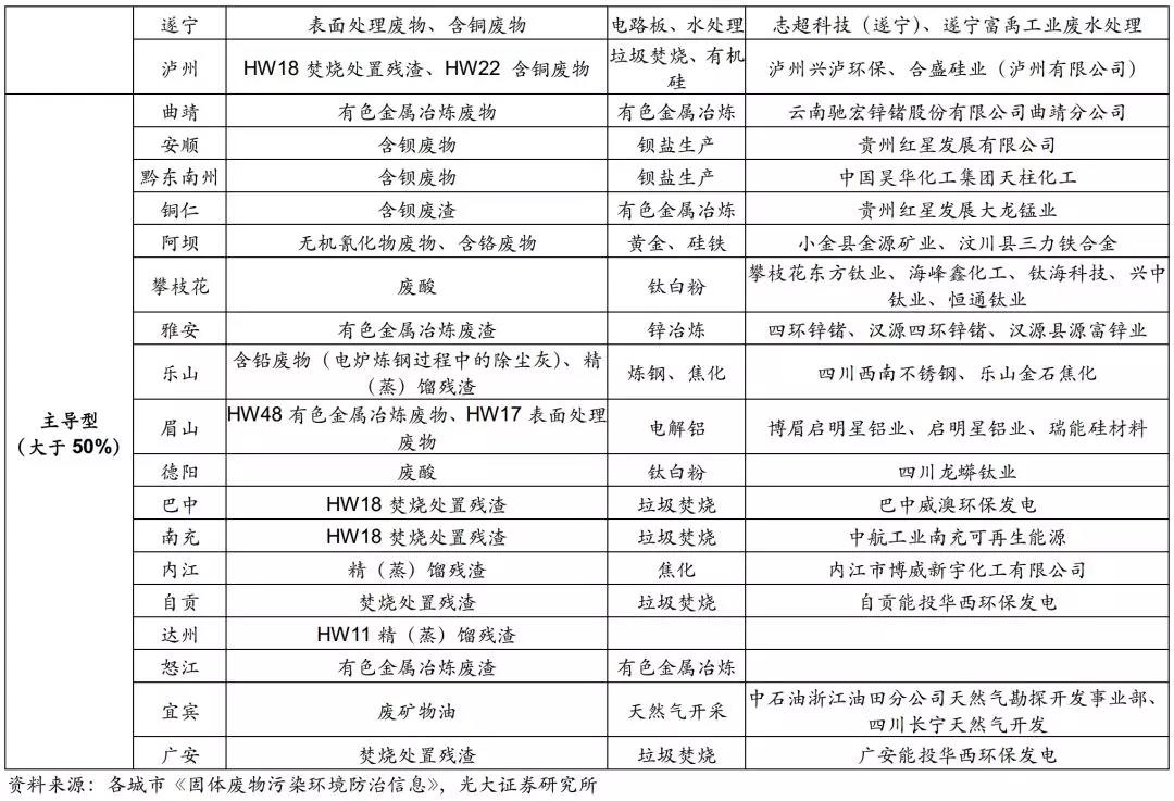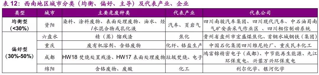 因此,我們認(rèn)為西南地區(qū)應(yīng)重點(diǎn)關(guān)注通信設(shè)備、計(jì)算機(jī)及其他電子設(shè)備制造業(yè)及黑色金屬冶煉及壓延加工業(yè)所產(chǎn)生的危廢,如含銅廢物、廢酸等。此外,貴州、云南作為有色金屬大省,工業(yè)總產(chǎn)值不高,但相關(guān)產(chǎn)業(yè)發(fā)達(dá),也需要重點(diǎn)關(guān)注。